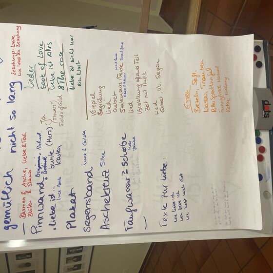 „Knoten wir uns ein Segensband um den Arm?“, „Ja, aber ich will auch noch was an die Pinnwand schreiben.“ „Lässt du dir ein Aschekreuz auf die Stirn zeichnen?“ „Die Liebe ist stärker als der Tod, aber die Endlichkeit des Lebens macht es wertvoll“.