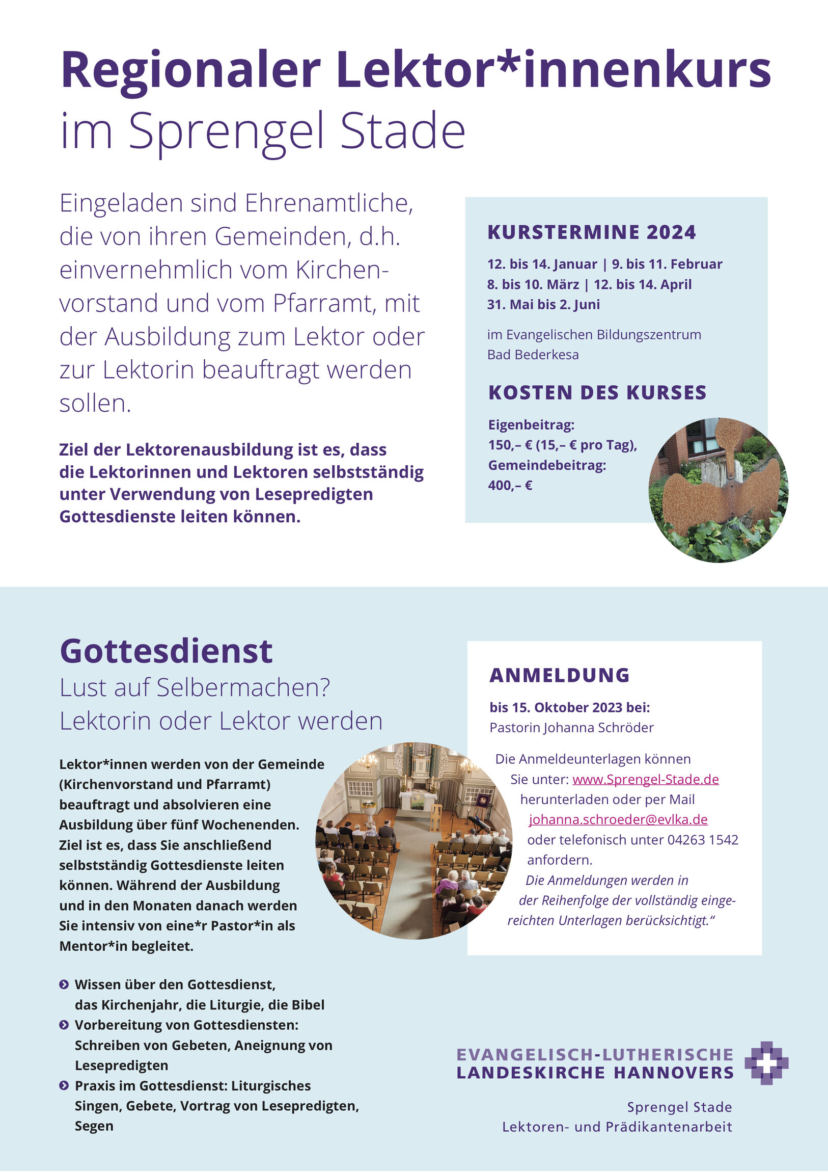 Der nächste Kurs für den Sprengel Stade startet 2024. Die Seminarwochenenden finden in Bad Bederkesa statt.