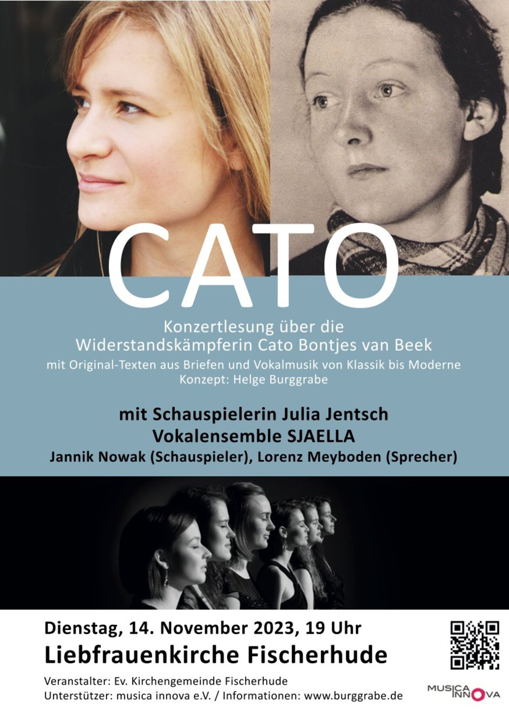 Die Evangelische Kirchengemeinde Fischerhude und der Förderverein musica innova e.V. laden am 14. November 2023 um 19 Uhr zu einer Konzertlesung in die Liebfrauenkirche Fischerhude ein. Aufgeführt wird die von dem Komponisten Helge Burggrabe entwickelte Musik-Text-Collage „CATO“ über die Widerstandskämpferin Cato Bontjes van Beek. Wie im gleichnamigen Konzertfilm (2020) werden Original-Texte aus Briefen der Cato von der Schauspielerin Julia Jentsch gelesen, die vor 18 Jahren bereits Sophie Scholl im Kinofilm spielte. Der Hamburger Schauspieler Jannik Nowak interpretiert die männlichen Rollen und als Erzähler führt der Sprecher Lorenz Meyboden durch den Abend. Die Texte betten sich ein in ausdrucksstarke Vokalmusik, die vom Vokalensemble SJAELLA aus Leipzig gesungen wird. Dabei sind von Helge Burggrabe neu vertonte Cato-Texte ebenso zu hören wie Musik, die Cato viel bedeutete, von Johann Sebastian Bach bis zu Schlagern aus den 1930er Jahren wie „Bei Mir Bistu Shein“. Die Konzertlesung würdigt Cato Bontjes van Beek, die mit nur 22 Jahren am 5. August 1943 in Berlin-Plötzensee hingerichtet wurde. Sie wuchs in einer Künstlerfamilie in Fischerhude bei Bremen auf und entwickelte schon früh ein erstaunliches Interesse an Sprache, fremden Kulturen und fernöstlicher Philosophie. In Berlin entwarf und verteilte sie für die Widerstandsgruppe „Rote Kapelle“ Flugblätter - und wurde verhaftet. Ihre Briefe aus der fast zehnmonatigen Haft zählen zu den eindrucksvollsten Zeugnissen einer politischen Gefangenen während der NS-Zeit.