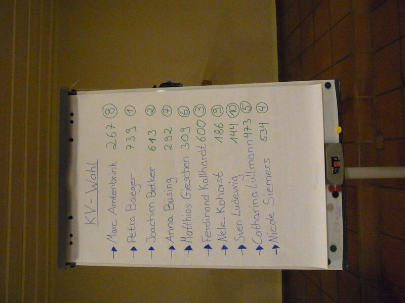 Und dann wurde endlich das Ergebnis gezeigt. Gewählt wurden Marc Amtenbrink, Joachim Betker, Petra Baeger, Anna Katharina Büsing, Matthias Gieschen, Ferdinand Kallhardt, Catharina Lüllmann und Nicole Siemers.