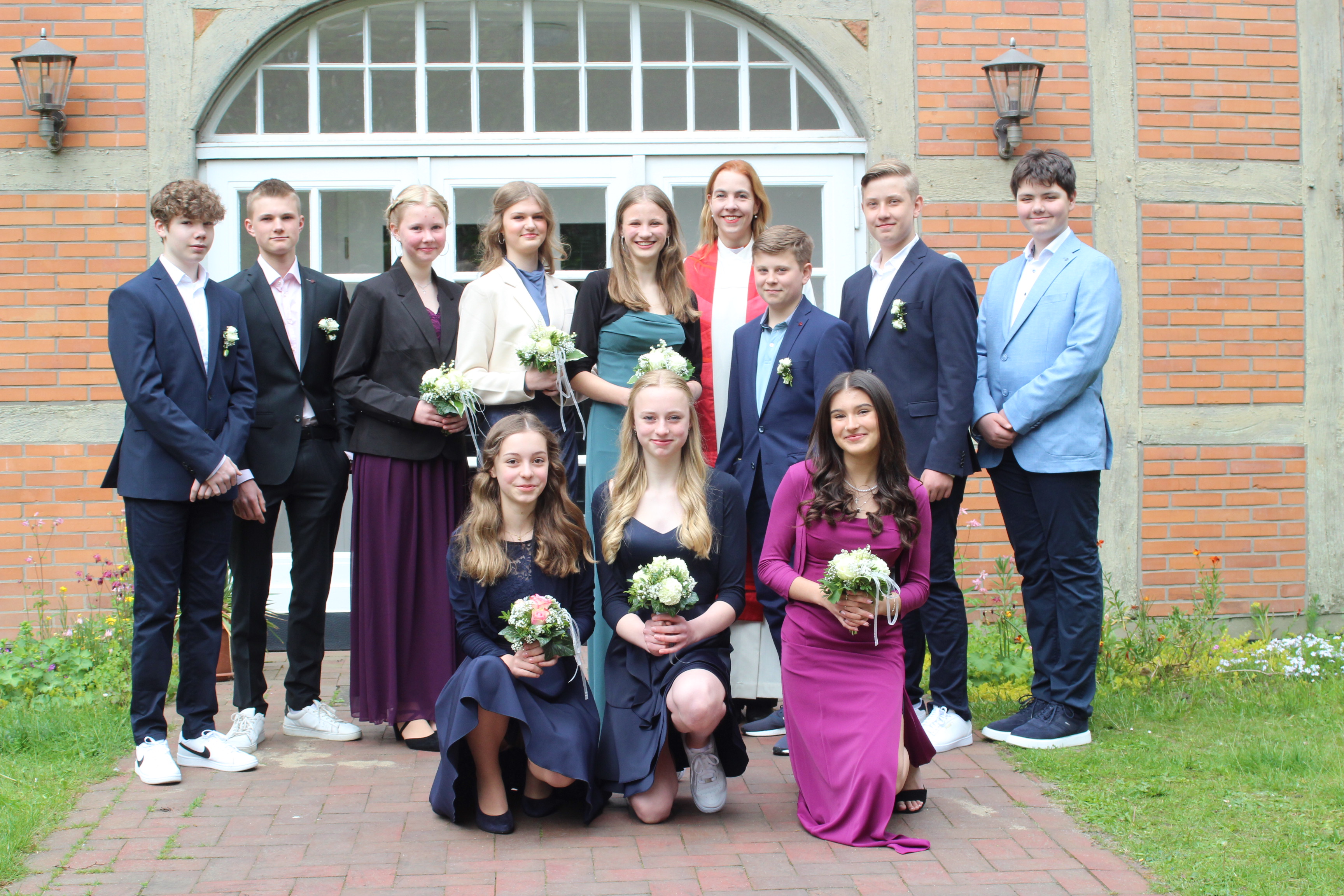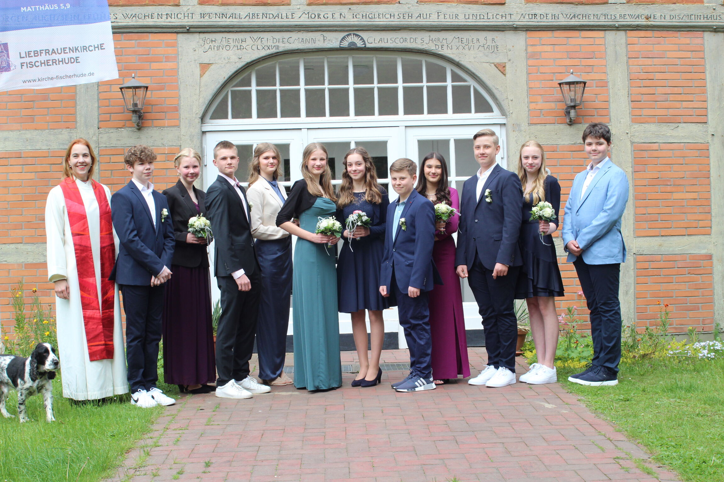 Aber da, von nebenan hört man leises Gesumme... ach ja, der Gospelchor probt noch einmal. Und da kommen auch schon fröhlich, schnatternd ein paar Konfirmandinnen. Hübsch sehen sie aus! Auch wenn so manche auf ihren Schuhen gar nicht laufen kann. „Wo sind denn die Jungs“, frage ich. „Ach, irgendwo auf der Straße“. Ist die Antwort. Sollten sie nicht alle hier sein? Hier beim Treffpunkt am Alten Pastorenhaus? Gleich kommt doch die Fotografin, und so viel Zeit bleibt uns nicht mehr bis zum Einlaufen in die Kirche.