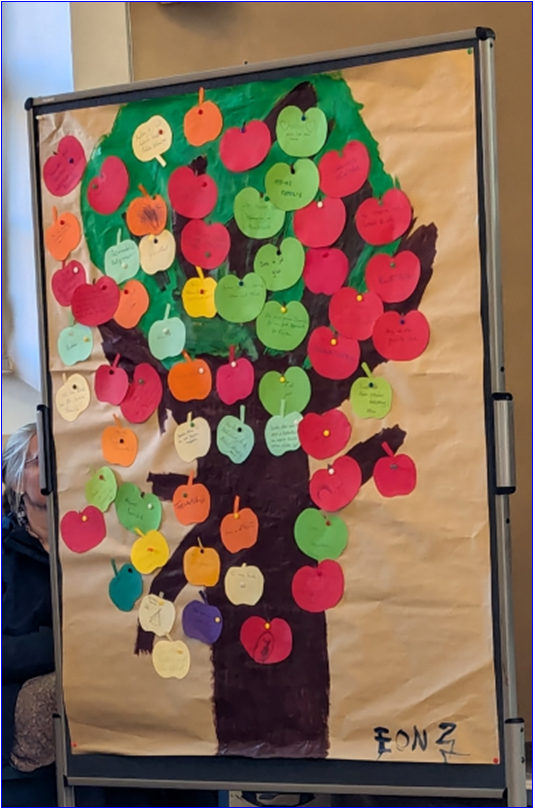 Am letzten Sonntag im September fand dann unser Familiengottesdienst statt. Wir haben uns sehr gefreut, dass so viele Menschen daran teilgenommen haben. Vor dem Altar waren viele unterschiedliche Gemüsesorten passend zum Thema ,,Erntedank“ ausgebreitet. In dem Gottesdienst ging es auch um den Apfel. Jede Person hat am Eingang der Kirche einen ausgeschnittenen Papier-Apfel bekommen. Darauf durfte man schreiben, wofür man dankbar ist. Diese Äpfel wurden alle an einen vorbereiteten Apfelbaum aufgehängt.
