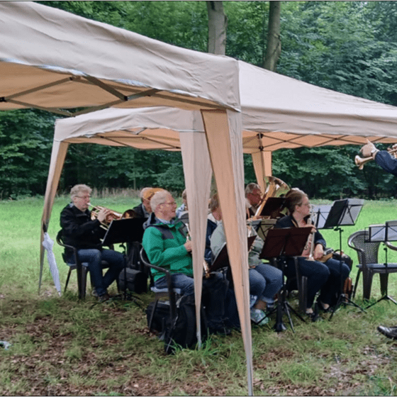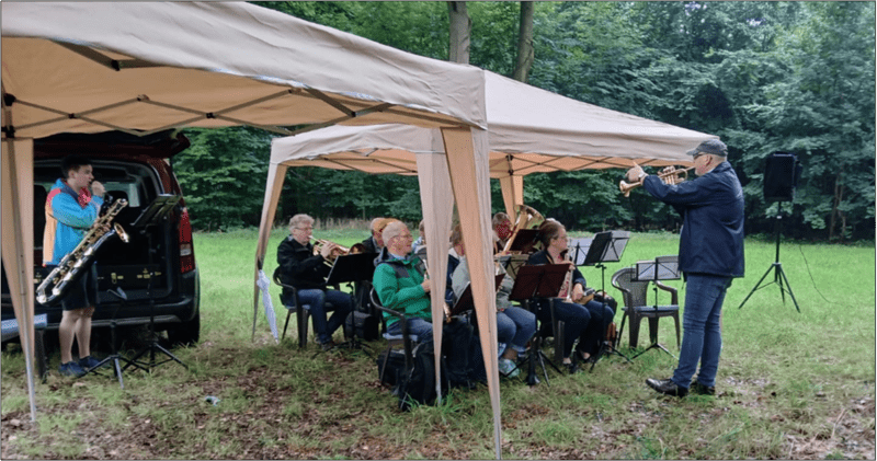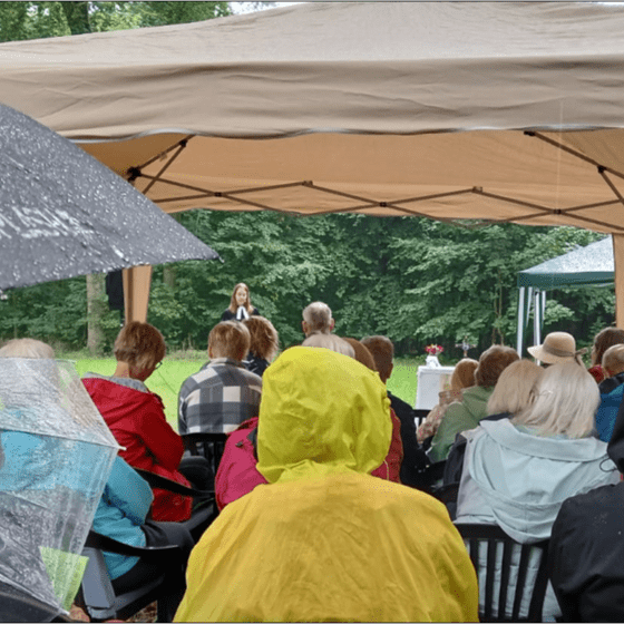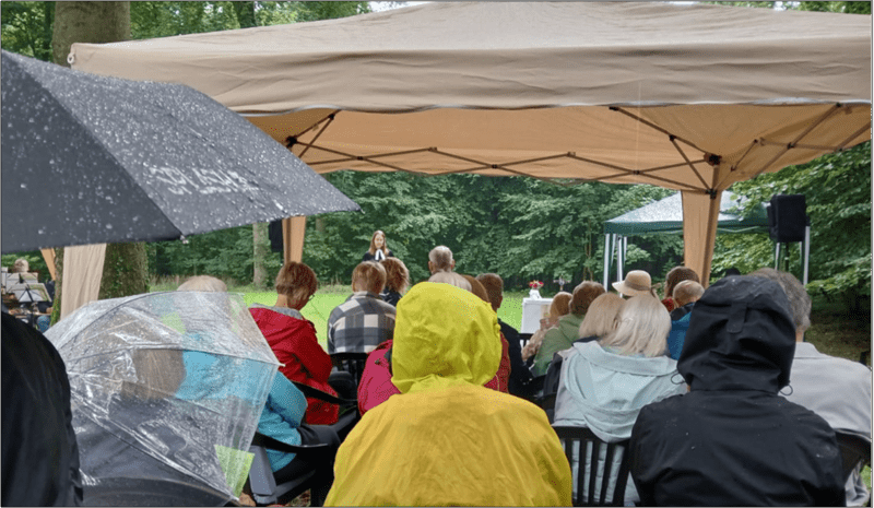 Um 07:00 Uhr fing es an zu regnen. Um 09:45 Uhr nahm ich dann doch das Auto. Es regnete immer noch. Ein Blick in die Kirche – niemand da. Also schnell weiter in die Surheide. Tatsächlich! Die Gemeinde trotzt dem Regen. Drei Pavillons waren aufgebaut worden. Unter einem residierte der Posaunenchor, der nächste beherbergte den Mann am Keyboard und unter dem letzten fanden einige Gottesdienstbesucher Platz. Drumherum waren Stühle und Bänke aufgestellt. Gut besetzt mit Menschen unter Schirmen oder in Regenjacken.