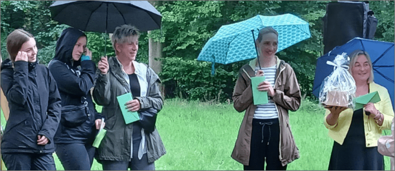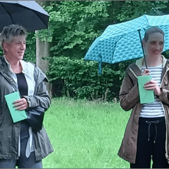 Wir sangen „Geh aus mein Herz und suche Freud“. Pastorin Kuhlmann begrüßte die Gemeinde und munterte uns mit den Worten „Regen ist flüssiger Sonnenschein“ auf. Da konnten wir gar nicht anders, als „Großer Gott wir loben dich“ mit kräftiger Stimme zu singen.
