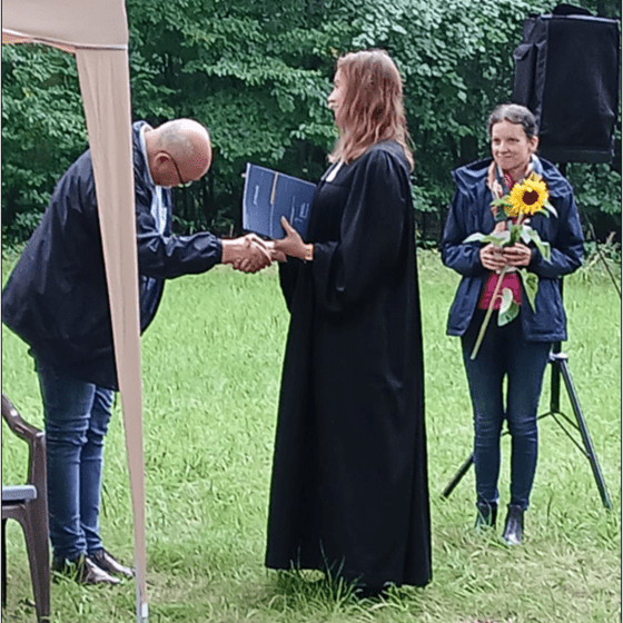Dann wurde es zum zweiten Mal feierlich. Geehrt wurde der Leiter des Fischerhuder Posaunenchors, Armin Hennig für 25 Jahre im Dienste des Wohlklangs. Es ist einfach etwas wunderbares, ein echter Schatz solch einen Chor in unserer Gemeinde haben zu dürfen. Gut wenn man einen Leiter hat, der kontinuierlich, immer auch erneuernd und vor allem mit dem Herzen bei der Sache ist. Gedankt wurde auch Christine Dahlweg und Martin Dobers. Beide sind jeweils seit 60 Jahren dabei. Das ist wahre Leidenschaft! Die Menschen dankten mit herzlichem Applaus. Der Posaunenchor gab zum Ende des Gottesdienstes noch eine Zugabe: „I have a dream“ von ABBA. Danach zog es uns ans Schützenhaus. Der Gemeindebeirat hatte wieder wunderbar vorgesorgt und aufgetischt. Die große Buche beschirmte die Menschen, den Kaffee und die Kekse.