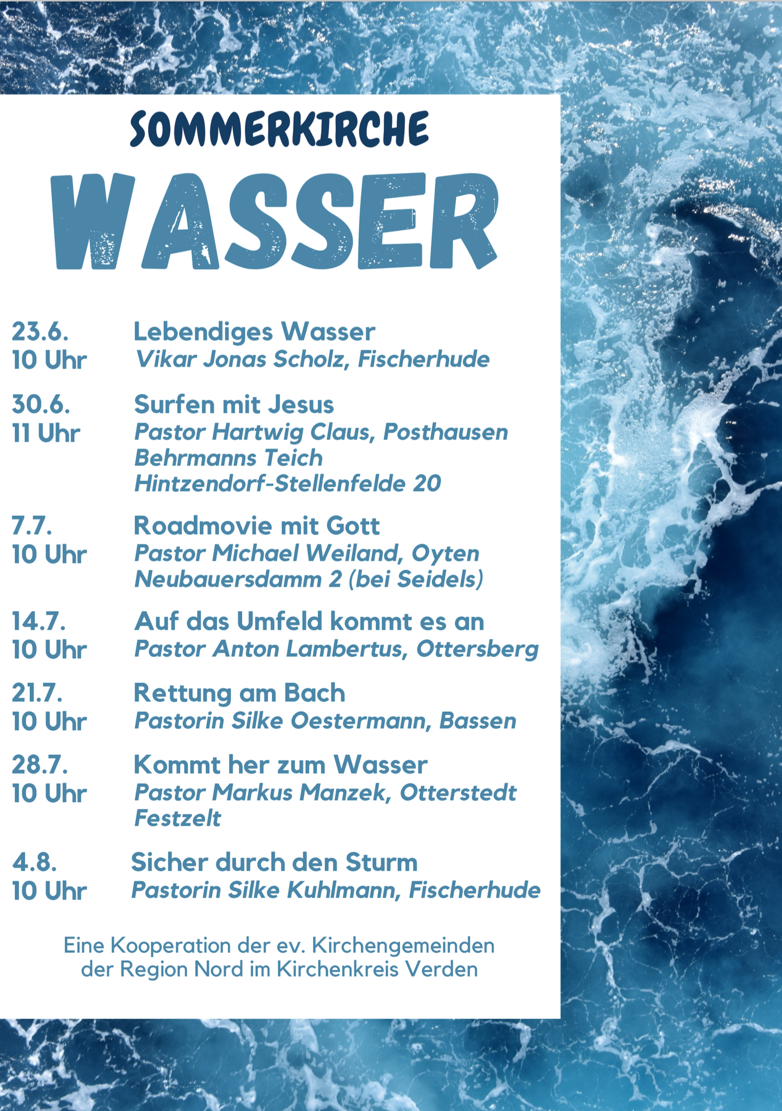 - 30. Juni, 11.00 Uhr: Surfen mit Jesus – Pastor Hartwig Claus, Posthausen, Behrmanns Teich, Hintzendorf-Stellenfelde 20