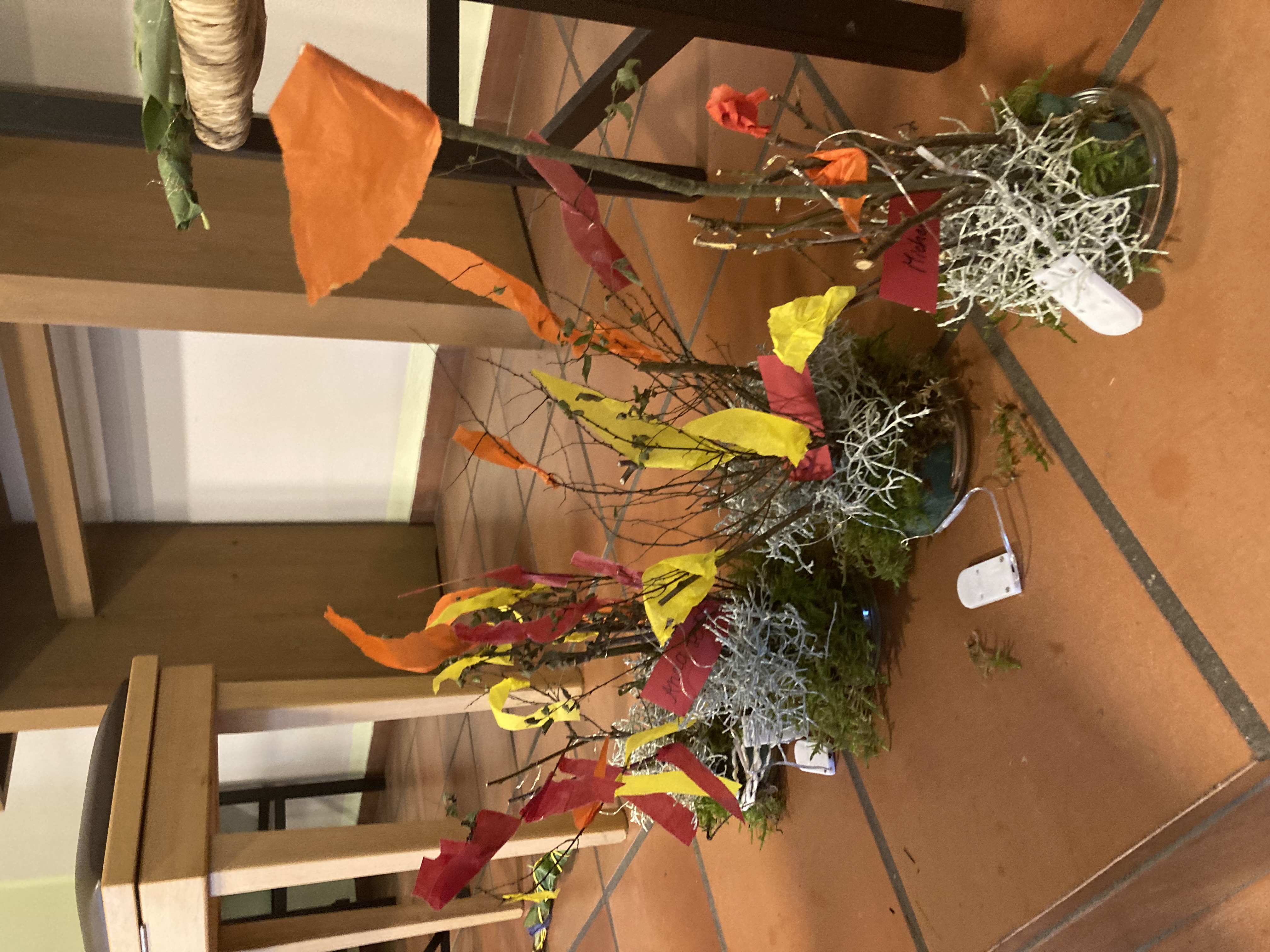 Auch das Erntedankfest wird im Kindergarten jedes Jahr gefeiert. Mit unseren Fritzis, das sind unsere großen Kinder, waren wir in der Kirche und haben uns die Gaben, die vorne liegen, gemeinsam angeschaut. Die Kinder konnten die verschiedenen Gemüse- und Obstsorten betrachten und dabei ist ihnen besonders der große Kürbis und die Erntekrone aufgefallen.