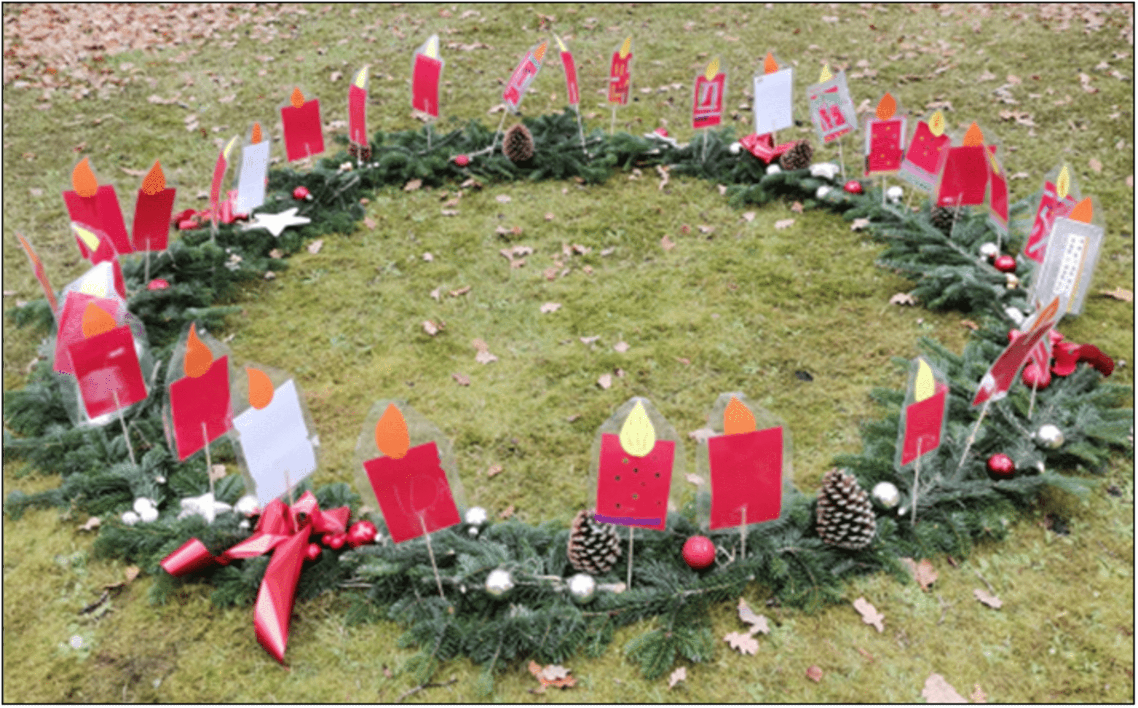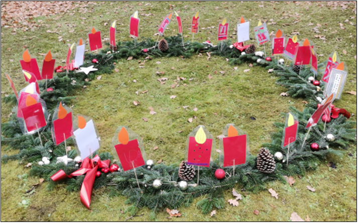 Weißt du, woher der Adventskranz kommt? Den hat sich Johann Hinrich Wichern ausgedacht, schon 1839 in Hamburg. Und das kam so: Als die Kinder in seinem Waisenhaus so ungeduldig waren und ihn jeden Tag fragten, wie lange es noch dauert, bis Weihnachten kommt, da hat er ein großes Kutschenrad genommen und 24 Kerzen darauf gesteckt, vier große, weiße Kerzen und 20 kleinere, rote. Das hat uns so gut gefallen, dass wir auch einen ganz großen Adventskranz für draußen gebastelt haben, mit Kerzen aus Tonpappe und Tannengrün.